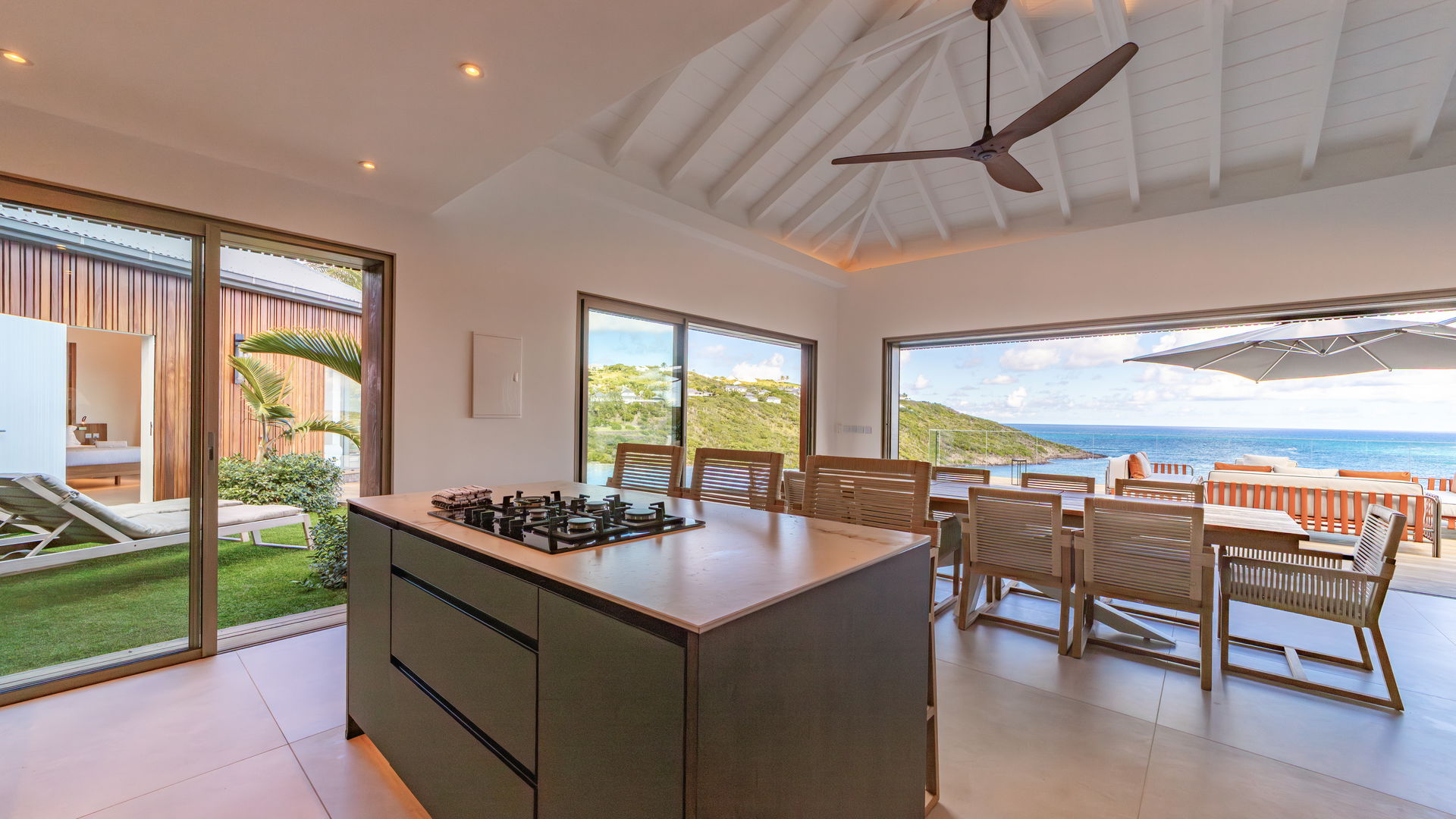 Built on several levels connected by exterior staircases, the villa St‑Barths RIVA opens onto the majestic spectacle of the island’s turquoise waters framed by lush vegetation. Fully open onto the terrace with pool, the living room features sofas, a flat‑screen TV and a coffee table in a soft ambiance. The indoor dining area accommodates up to 10 guests next to the fully equipped kitchen with central island, dining space and stools. The openings onto the front terrace with ocean view and onto the side garden bring in a soothing light, illuminating the poetic and comfortable decor of this vacation villa.