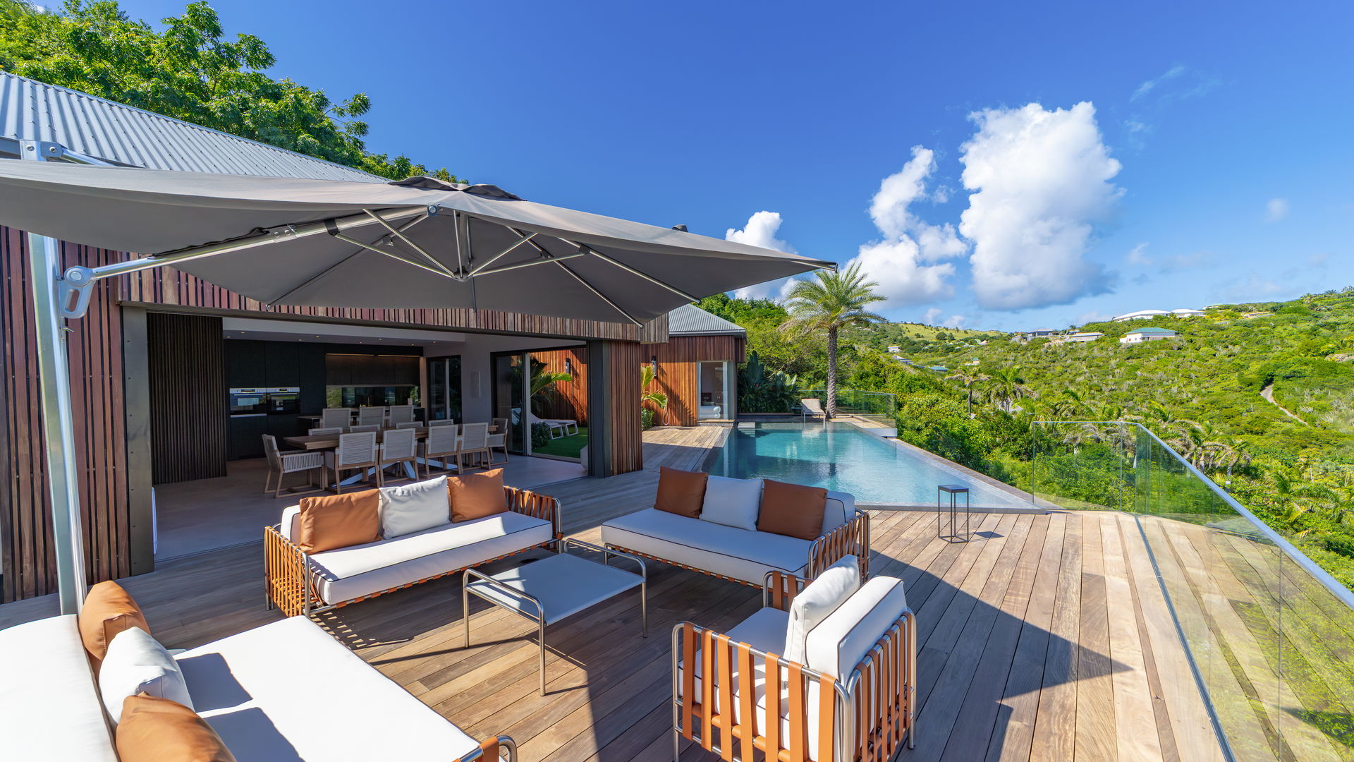 outdoor lounge with sofas and armchairs shaded by a large parasol. The pool sparkles under the St‑Barths sun, facing the ocean and the perfect horizon. On the side, the terrace features deckchairs among palm trees, a paradisiacal setting ideal for rest and relaxation. And a second pool is located on the lower level near the bedrooms, in a very private atmosphere and idyllic setting.