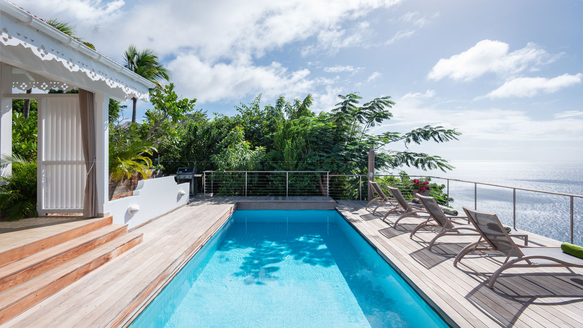 At the front of villa TI MOUN, the terrace opens onto a dazzling panorama of the ocean, the harbor, Shell Beach, and the endless horizon, glowing each evening under the golden colors of the sunset. Beneath the covered area, a woven-fiber outdoor lounge and an al fresco dining table for six guests invite guests to unwind and enjoy delicious meals. A few steps down, a modern table offers a peaceful spot to sit and chat while admiring the extraordinary ocean view. Under the brilliant Caribbean sun, the pool sparkles on the wooden deck lined with sun loungers, the perfect place to relax in utmost privacy.