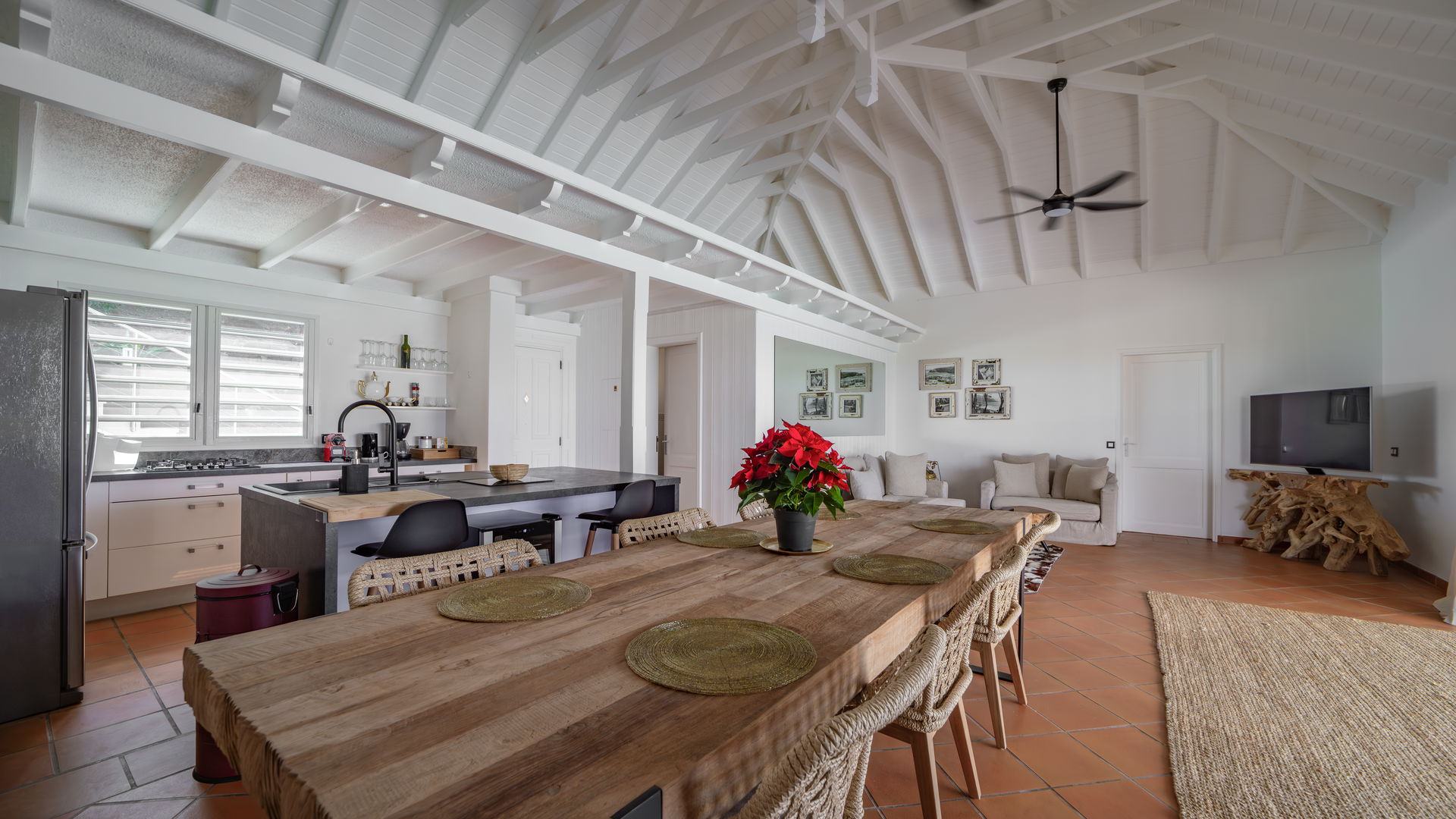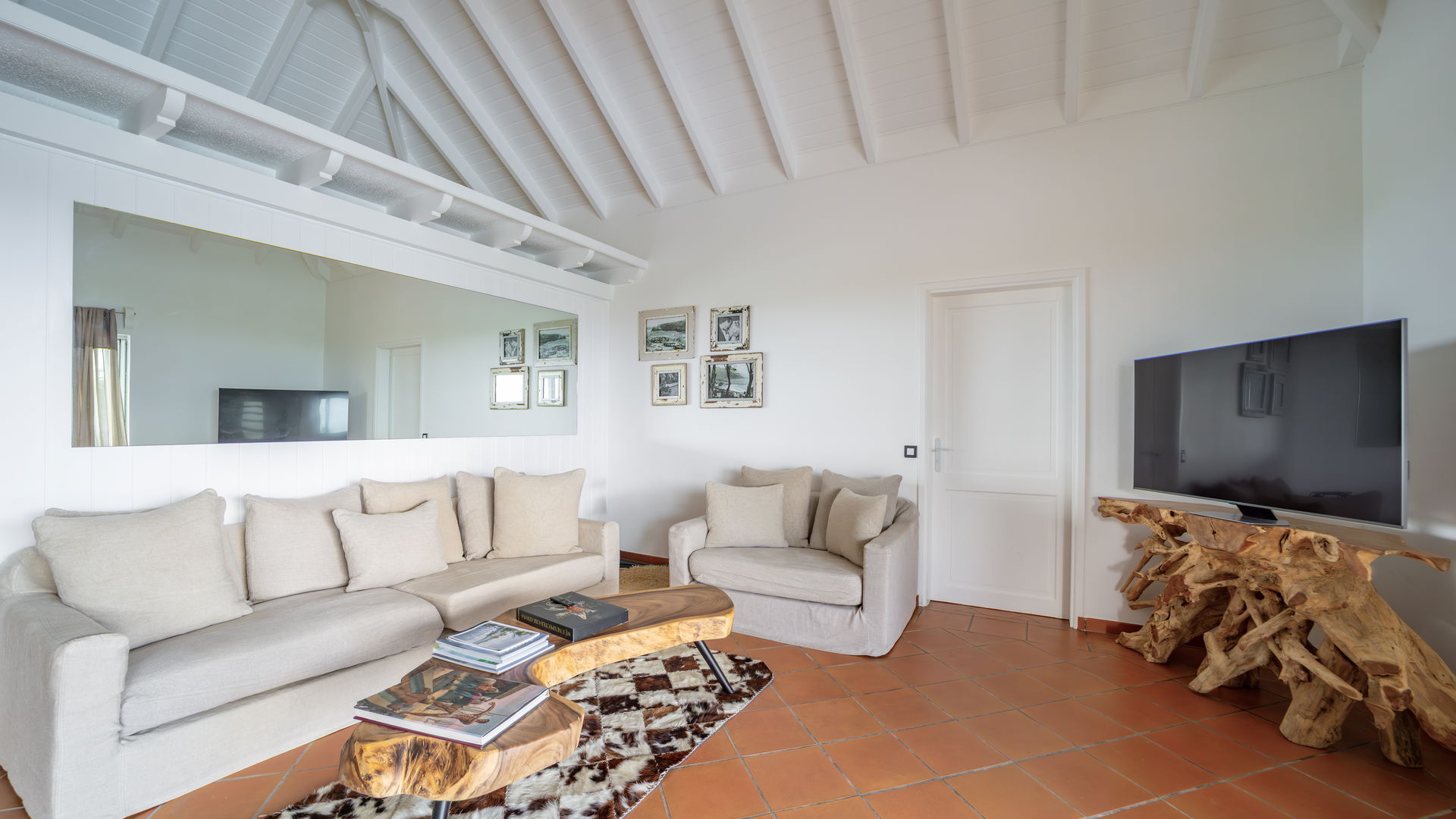 Designed on one level with a few steps, villa POLO in St-Barths opens onto a splendid view of the ocean and the tropical vegetation. The living room features a lounge area with comfy sofa and HD screen for pleasant evenings in a soft, intimate atmosphere. The indoor dining area accommodates you and your guests facing the bay window that opens onto the view. Close to it, you’ll find the fully equipped kitchen with central island, wine cellar and access to the landscaped rear garden. Warm and elegant, this interior sets the stage for delightful moments of relaxation in a driftwood‑inspired décor beneath the high vaulted ceiling.