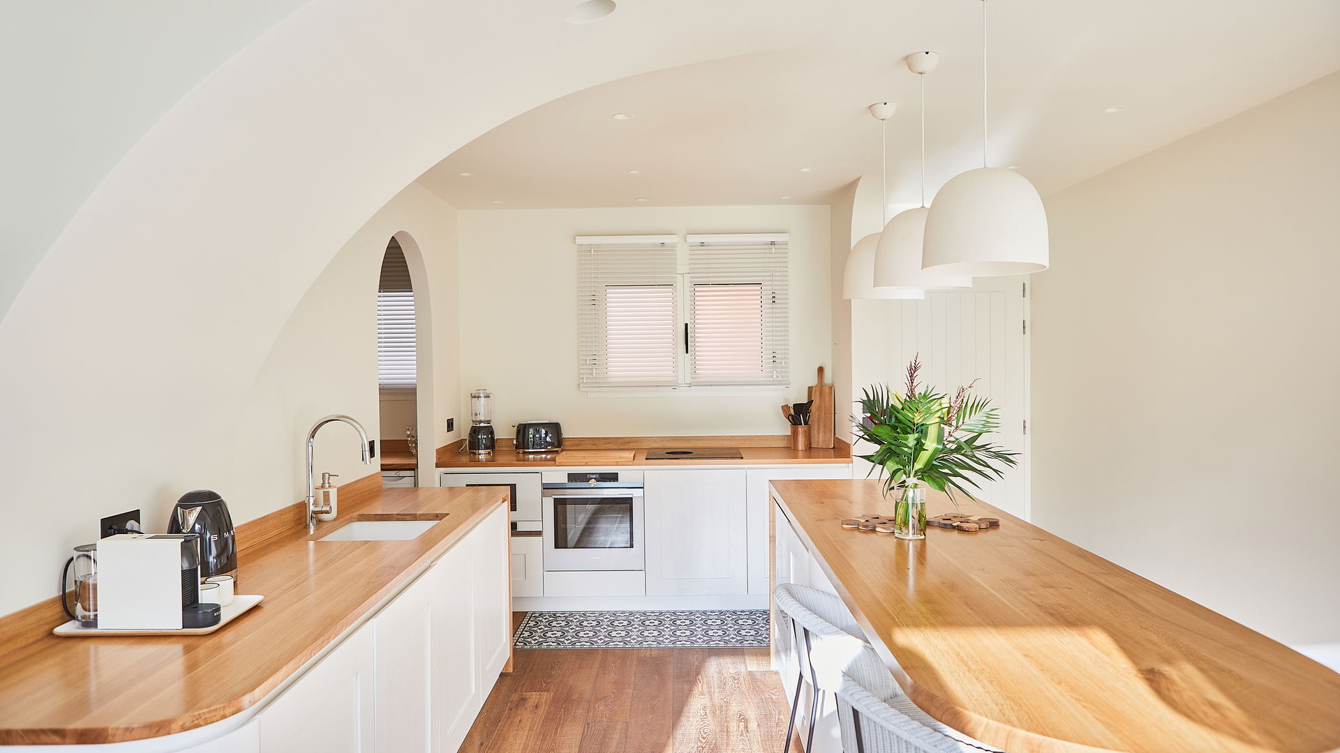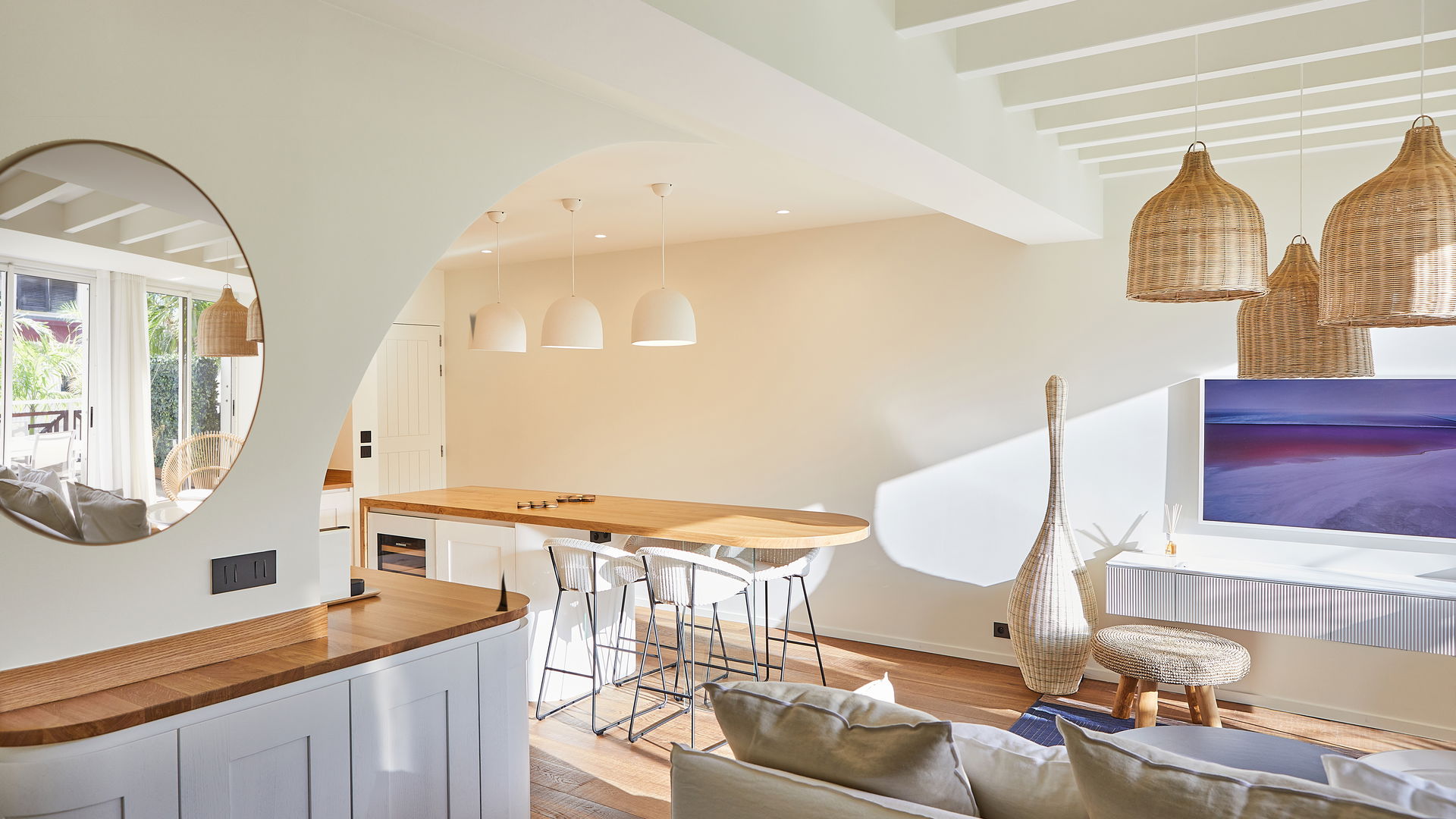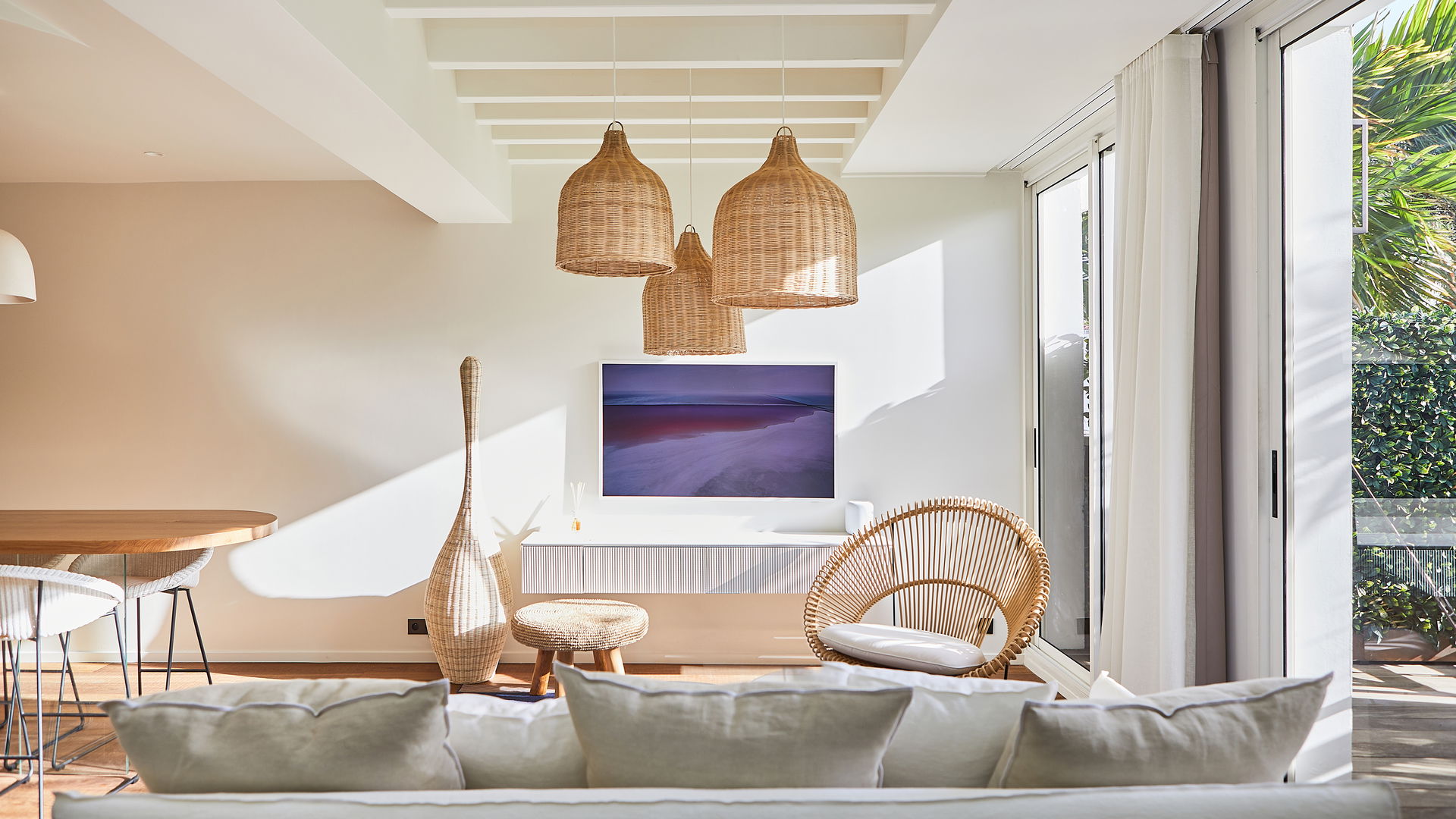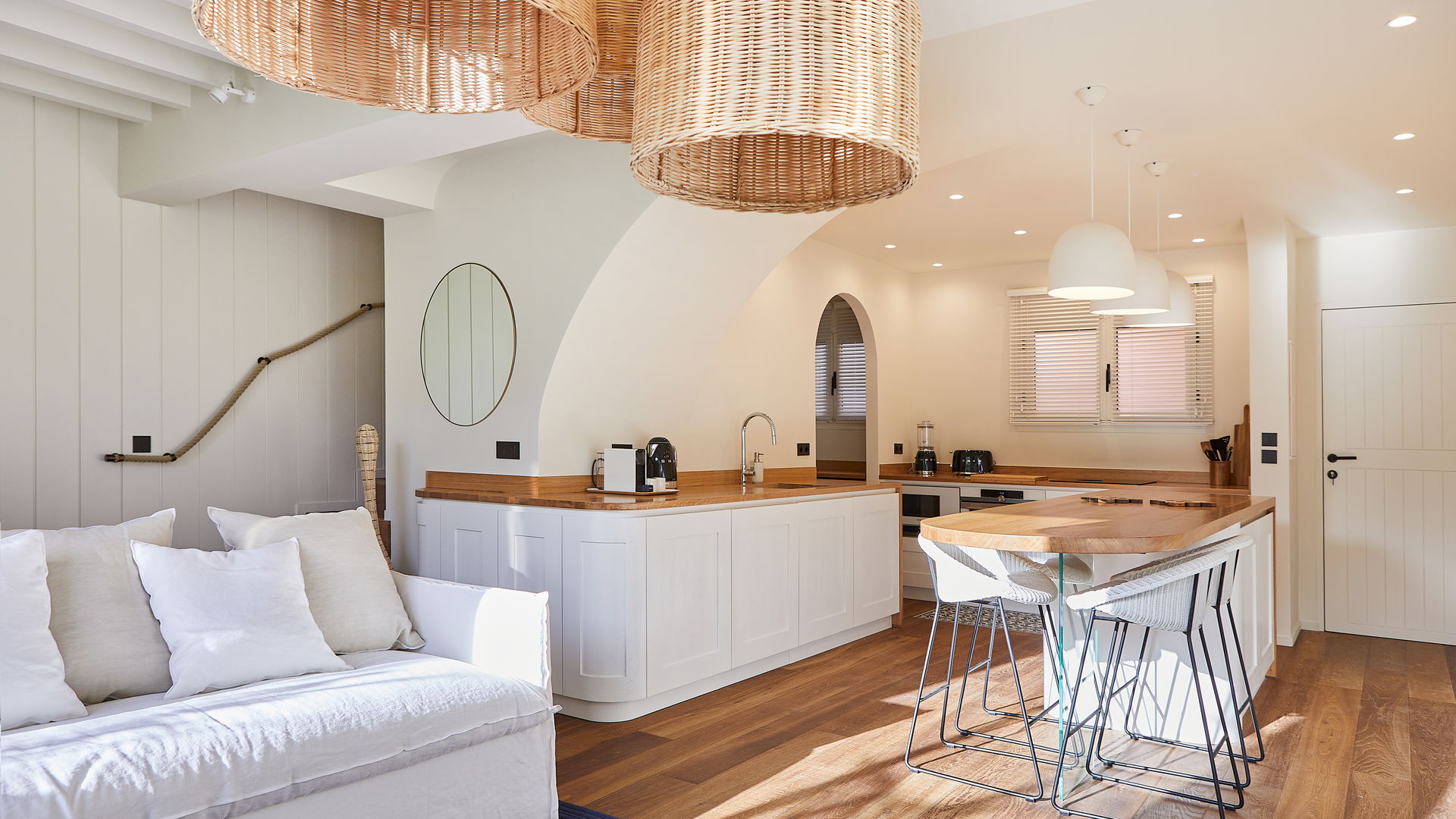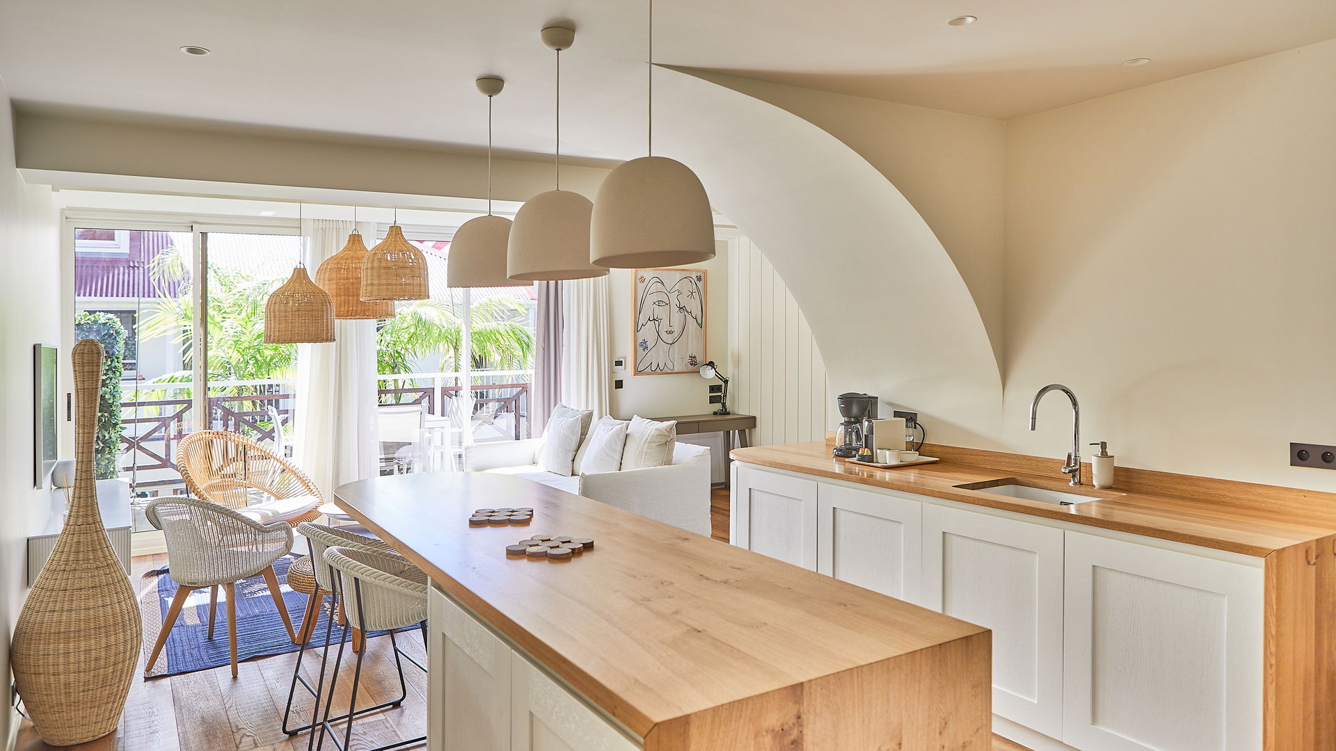 Designed over two levels connected by an interior staircase, this rental apartment is located on the second floor, offering a cozy and very bright atmosphere. In a cocoon-like, striking-white indoor space, the air-conditioned living area is divided into several sections, with a very comfortable lounge featuring a lovely sofa and wicker hints that provide a delightful warmth to the whole. At the back, the fully-equipped kitchen extends into the living room with a spacious dining area for four people, under pretty lights and an arched ceiling that enhance the pleasant feeling you’ll have in this very comfortable indoor space. You’ll also find a desk area near the bay window overlooking the terrace, in a very contemporary and modern style.