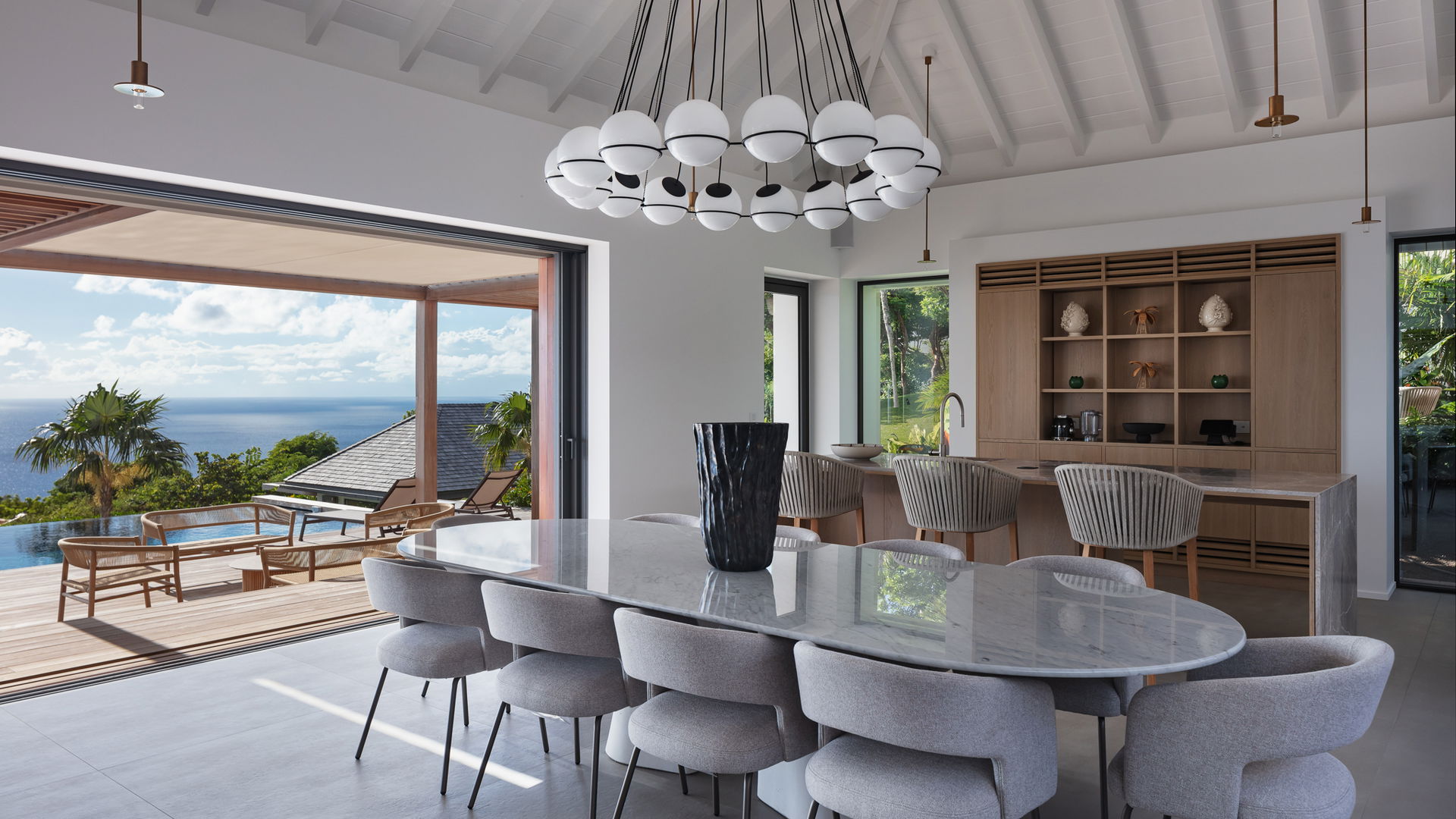 Spread across multiple levels and bungalows, the vacation rental NATACHA welcomes guests into its expansive and light-filled indoor spaces. Decorated in soft, neutral tones creating a calm atmosphere, the main living area opens fully onto a panoramic terrace. A generous sectional sofa, HD screen, and coffee table face the breathtaking view, a truly serene space to unwind. Close to it, the comfy indoor dining area accommodates up to ten guests and sits beside the bar with stools, an inviting spot for pleasant morning coffee or relaxed conversation. Just beyond, the rear terrace leads to the fully equipped kitchen, elegantly finished with dark wood accents, a central island and lovely tools.