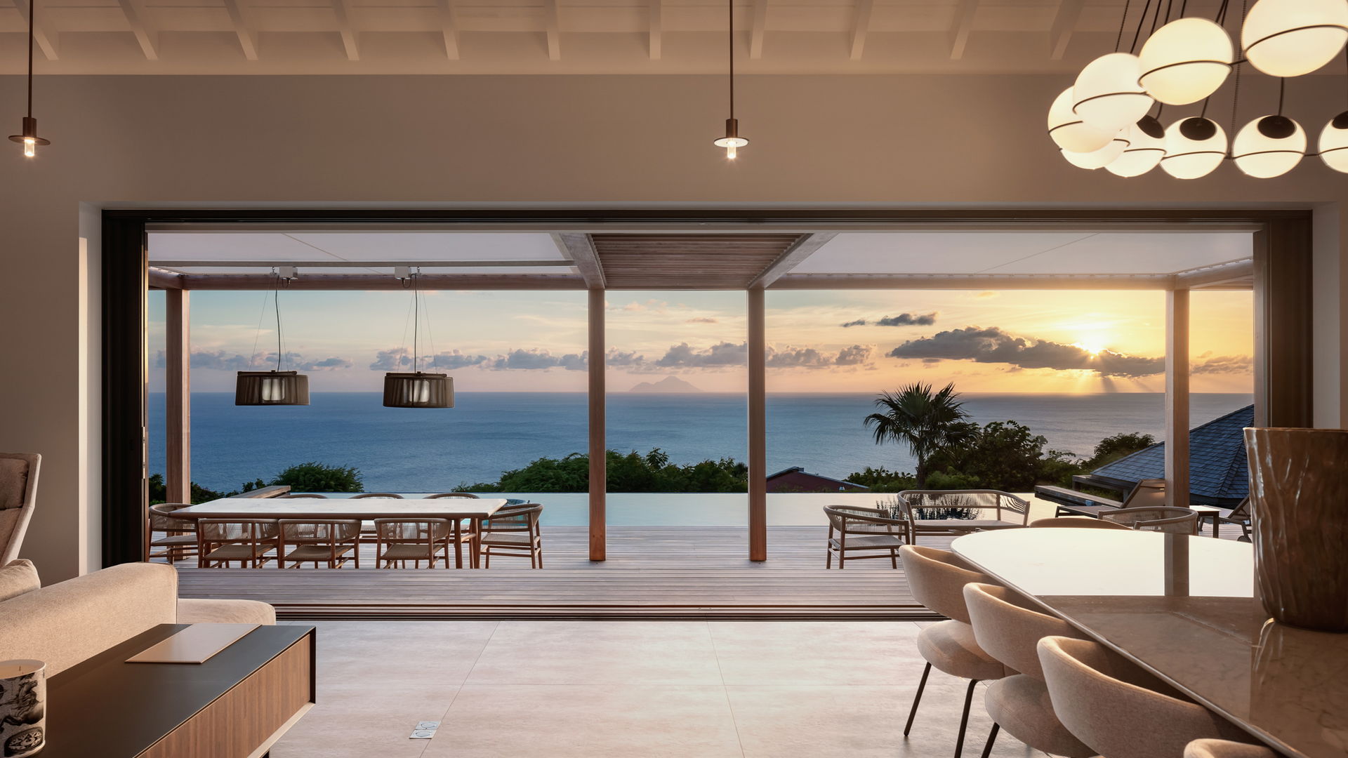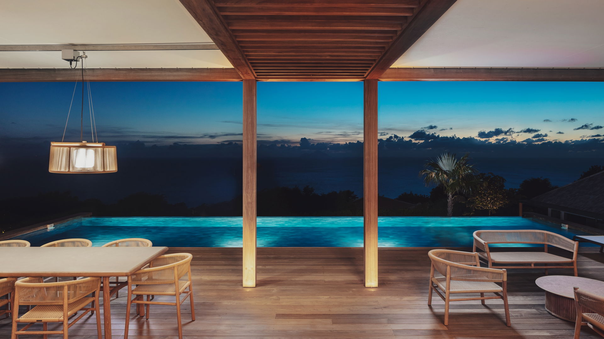 Out front, the terrace of villa NATACHA reveals a spectacular vista of the ocean and the lush tropical greenery. The infinity swimming pool blends seamlessly into the horizon, mirroring the vibrant blues of the Caribbean sky. There are sun loungers lining the deck, perfect for soaking in the view, sunbathing, reading and admiring the outstanding beauty of the Caribbean. And beneath the caramel-toned pergola, you’ll enjoy al fresco dining around the outdoor table, or sipping cocktails in the woven-fiber lounge, the ideal setting for easy conversation and laid-back evenings in a very private atmosphere.