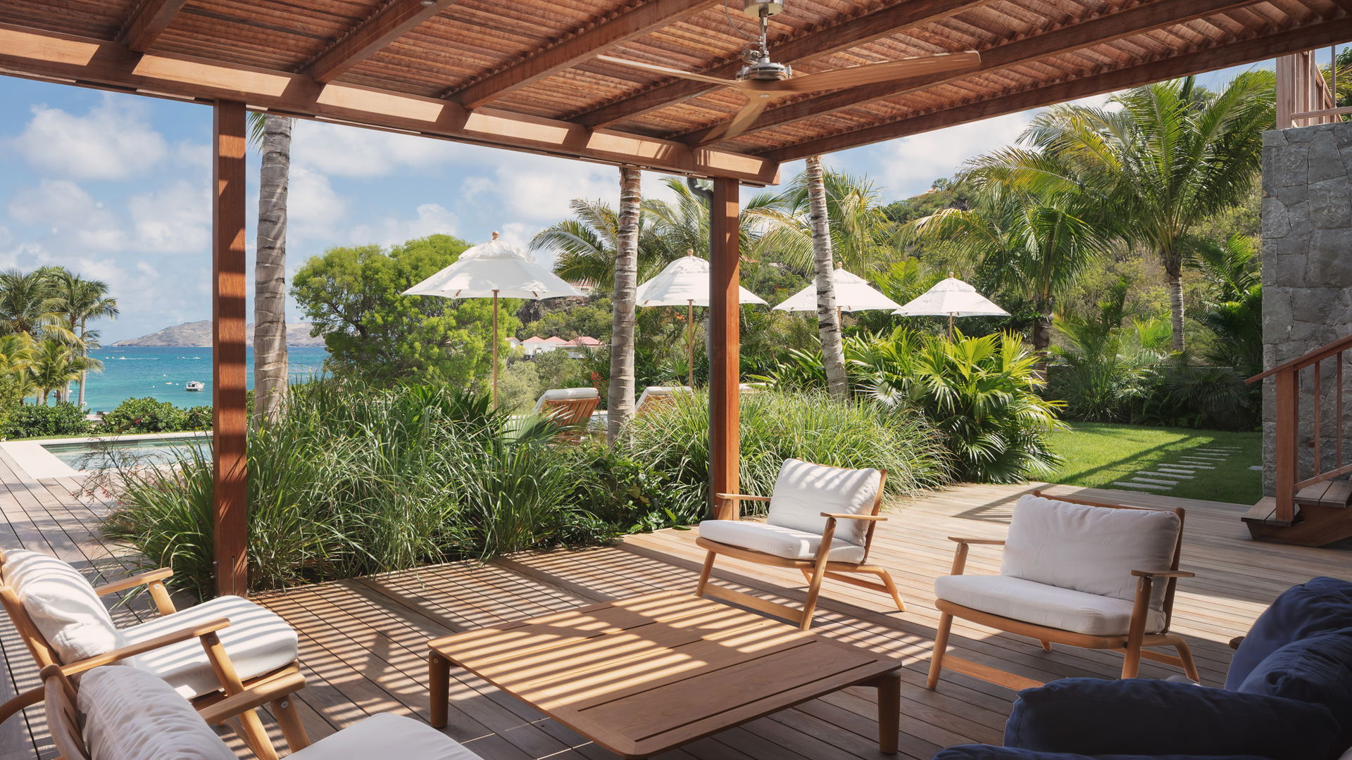 Spread across three levels connected by staircases, st barts villa BDM is a haven of luxury and elegance set directly on St-Jean Beach. On the main level, the living area features a lounge with plush sofas beneath a vaulted ceiling adorned with woven-fiber pendant lights. The indoor dining room invites you to enjoy meals in a cozy atmosphere enhanced by warm wood accents, adjacent to the fully equipped kitchen with direct access to the terrace. A professional kitchen completes the layout, ideal for hosting a private chef. The breathtaking view over the crystalline waters adds a serene sense of calm, heightened by the lush greenery visible through the rear access, where majestic palm leaves appear.