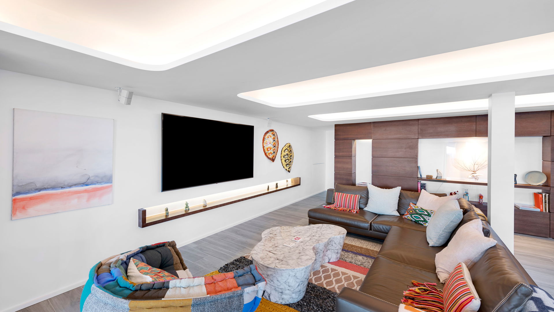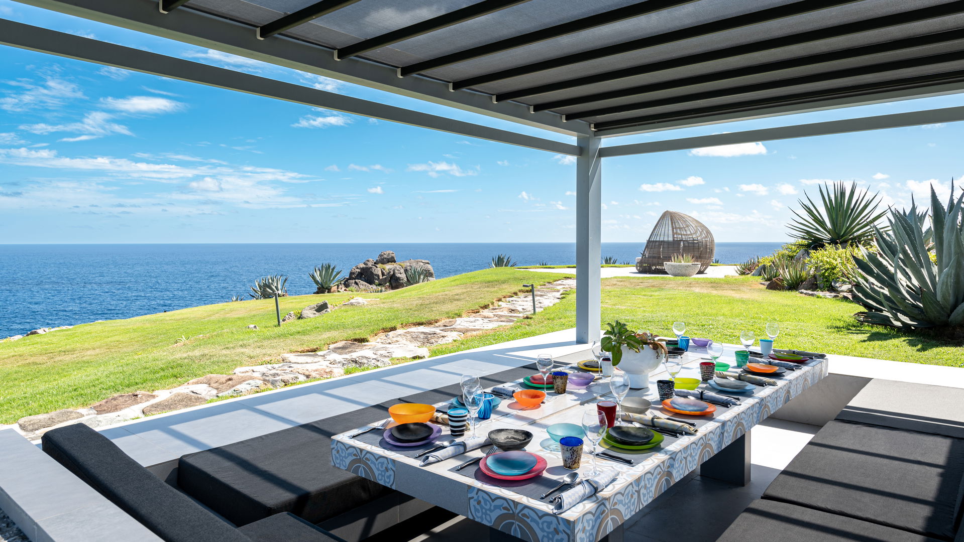 The large modern living room has many windows opening onto the outside, and is furnished with a large white sofa and armchairs around a coffee table, facing the panoramic view over the cliff and the ocean. Decorated with art, this welcoming room is very bright and luminous. Another lounge is located on the lower floor, and comes with a cinema projection room for pleasant movie nights in a warm atmosphere. The recently renovated, minimalist interior design focuses on white, the simplicity of lines, recessed lighting, mirror effects, and walls punctuated with large windows through which the ever-changing view becomes a constantly evolving painting.Indoor and outdoor dining rooms welcome you and your guests for delicious meals.