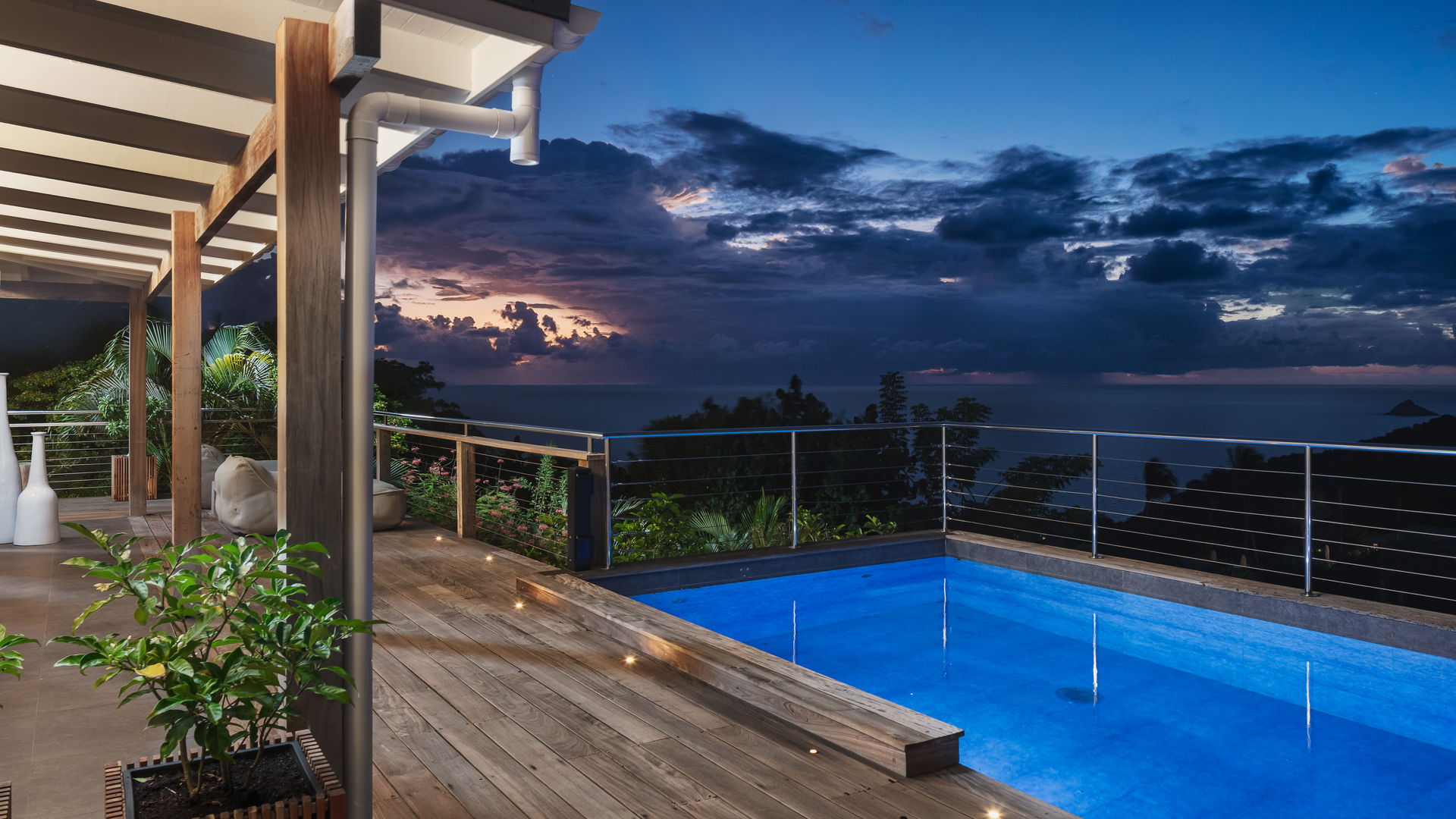 Outside, the terrace opens onto a spectacular view over the ocean and the green landscape of St. Barths. The large swimming pool is surrounded by sunbeds and chairs with soft cushions. There are also a garden lounge area, a table for four and a barbecue for unforgettable moments in the shade of the lovely foliage of the lush vegetation.