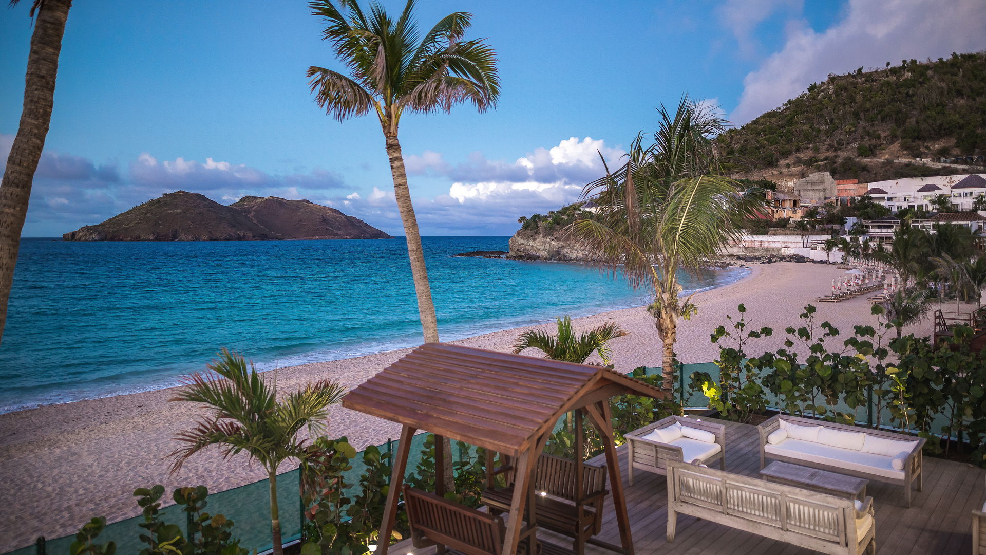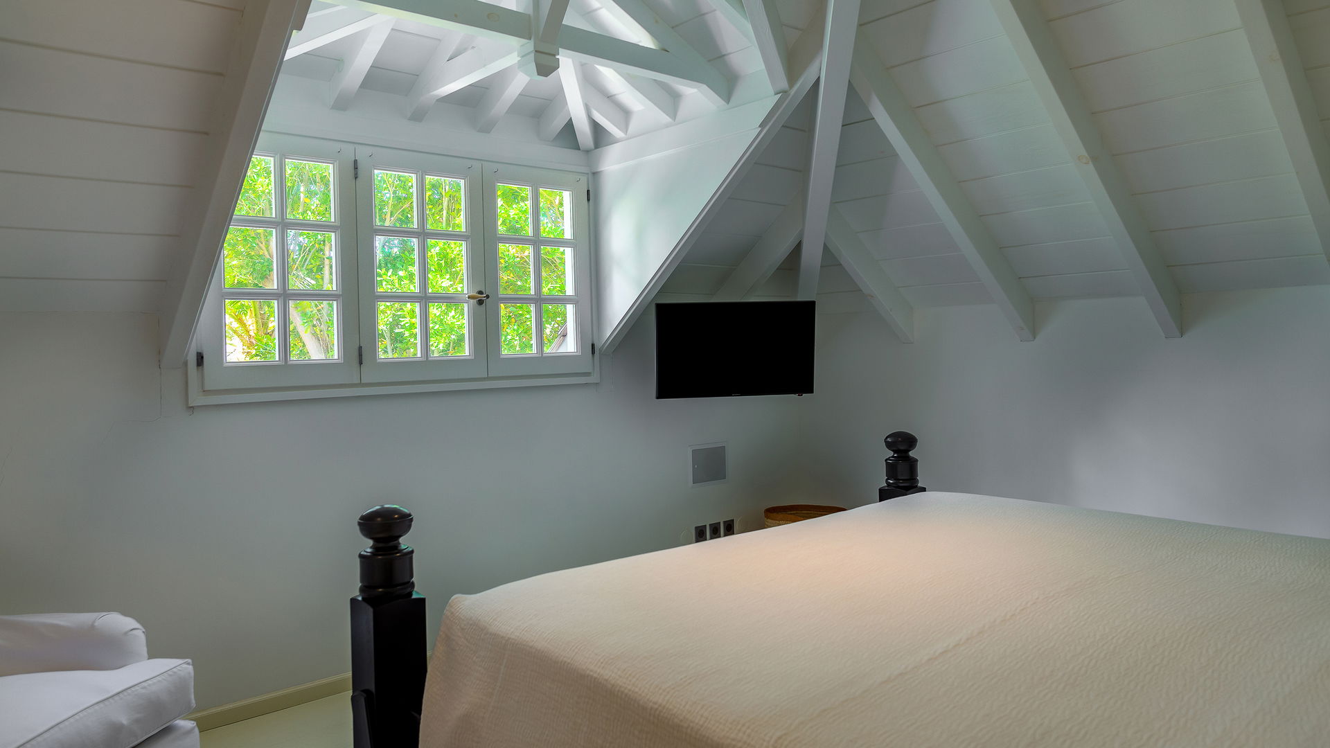 In the main central building, the large air-conditioned living room is a pure delight, with white parquet floors, a white sofa and armchairs, under a superb high whitewashed vaulted ceiling. In the elegant and beguiling great room, time seems to pass more slowly. In the back, the modern kitchen is well equipped for self-catering or private chef services. Open on three sides to the ocean breezes, this refined living room has an amazing view over the ocean, and the magnetic Flamands beach.