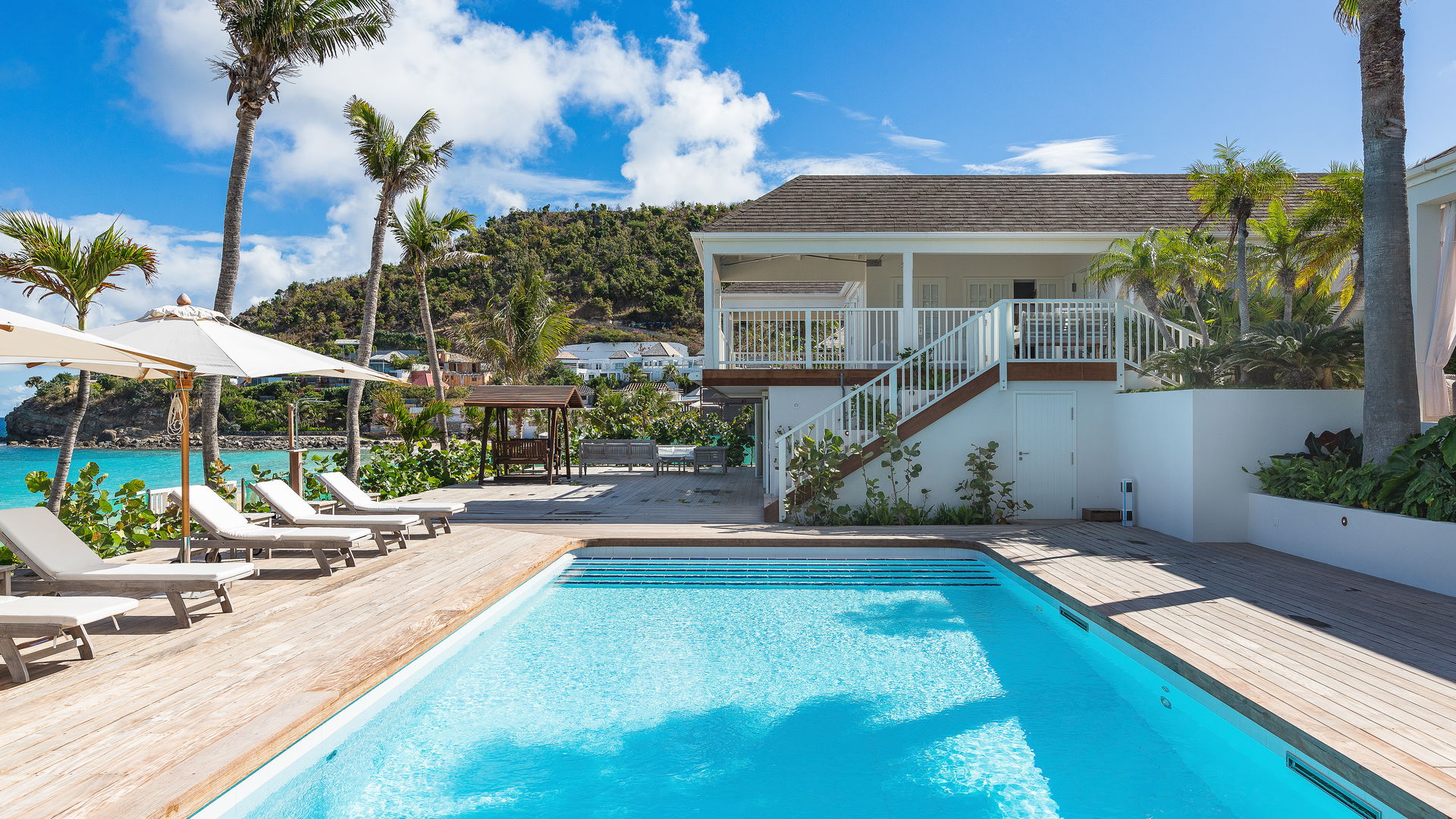 At the front, a beautiful two-level terrace faces the breathtaking view. There are large teak sofas, outdoor dining and a beautiful and azure colored heated pool for delightful outdoor moments. A covered swing and deck chairs are shaded by generous umbrellas. On the lower level, remote-controlled awnings provide additional shade. You can go to the beach a few steps from the terrace. Utmost luxury in St-Barths, there is also a private tennis court near the villa's garden.