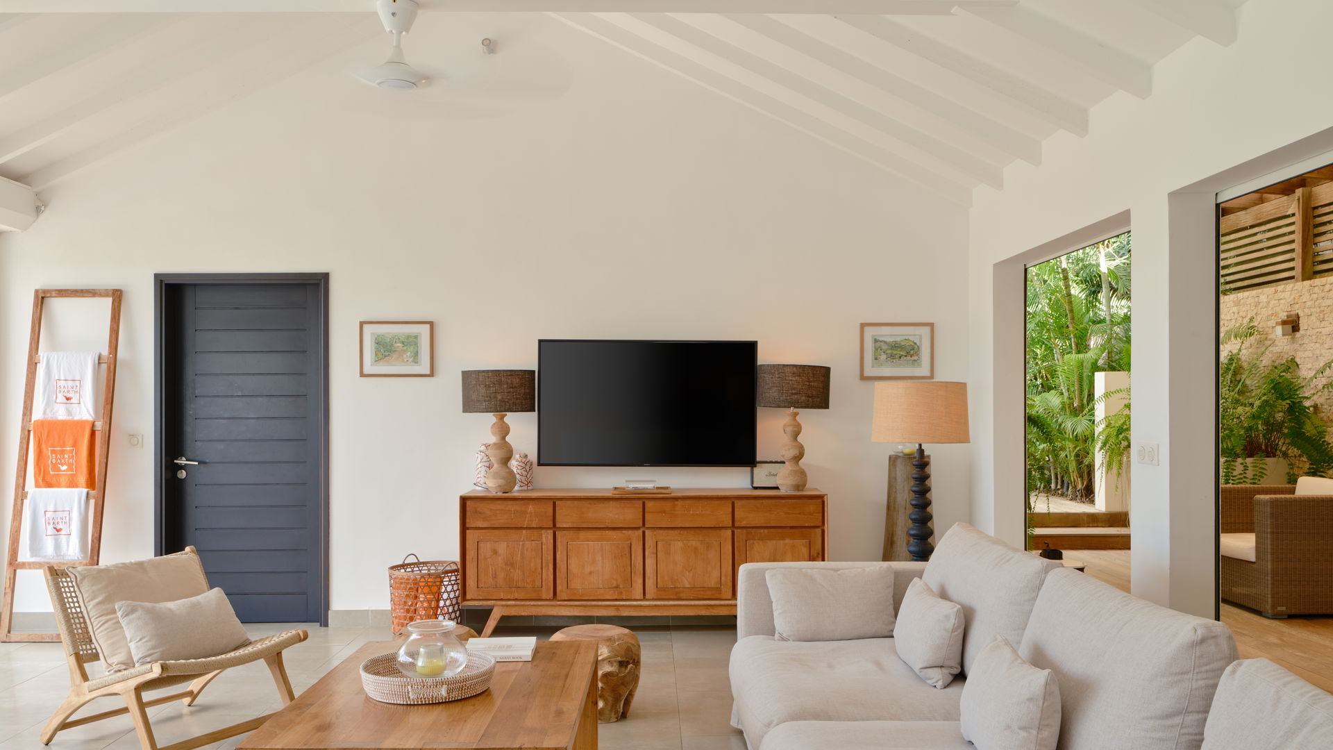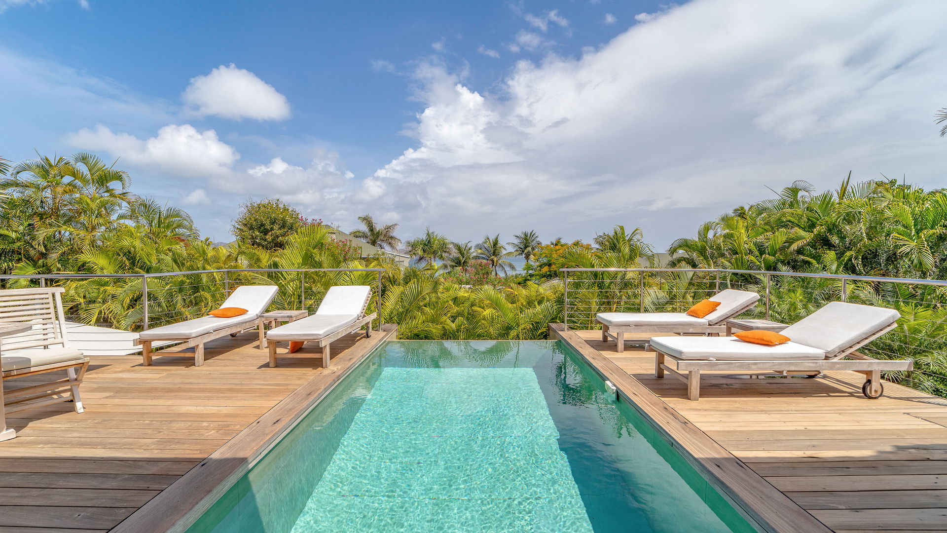 The front terrace features a beautiful infinity swimming pool for delightful moments between sky and sea. On either side of the pool, there are comfortable lounge chairs facing the breathtaking panorama. A second terrace overlooks the lush tropical garden on the lower level of the villa. You’ll enjoy this very private and idyllic space furnished with deckchairs and large cream-colored parasols.