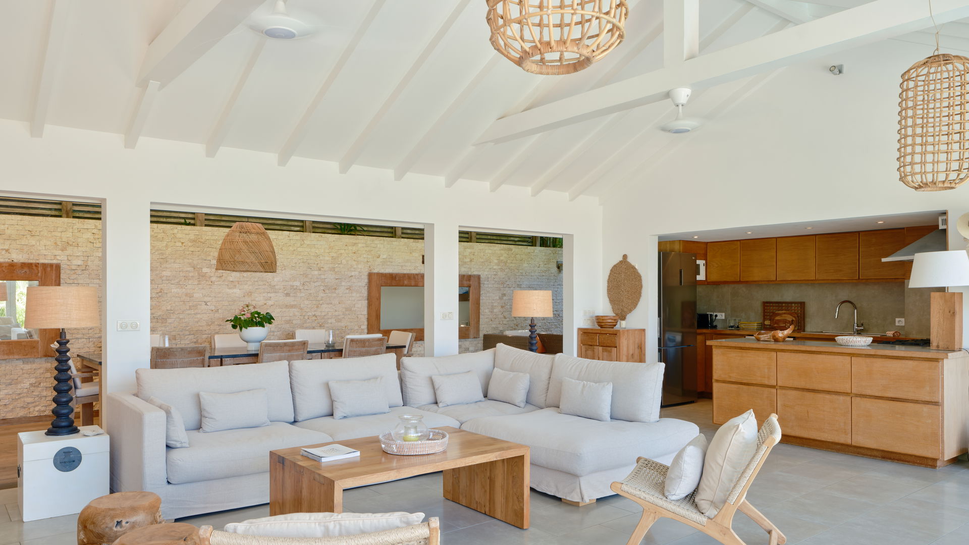 The spacious and airy living room fully opens onto the outdoors, with the lovely terrace furnished with woven fiber sofas and armchairs covered with soft cushions, blending perfectly the natural woods and crisp white tones. At the back of the living room on the covered terrace bordered by a stone wall, the dining room features a large table that can accommodate up to eight people. There is a well-equipped kitchen made of wood and stainless steel; a gas barbecue is also at your disposal.