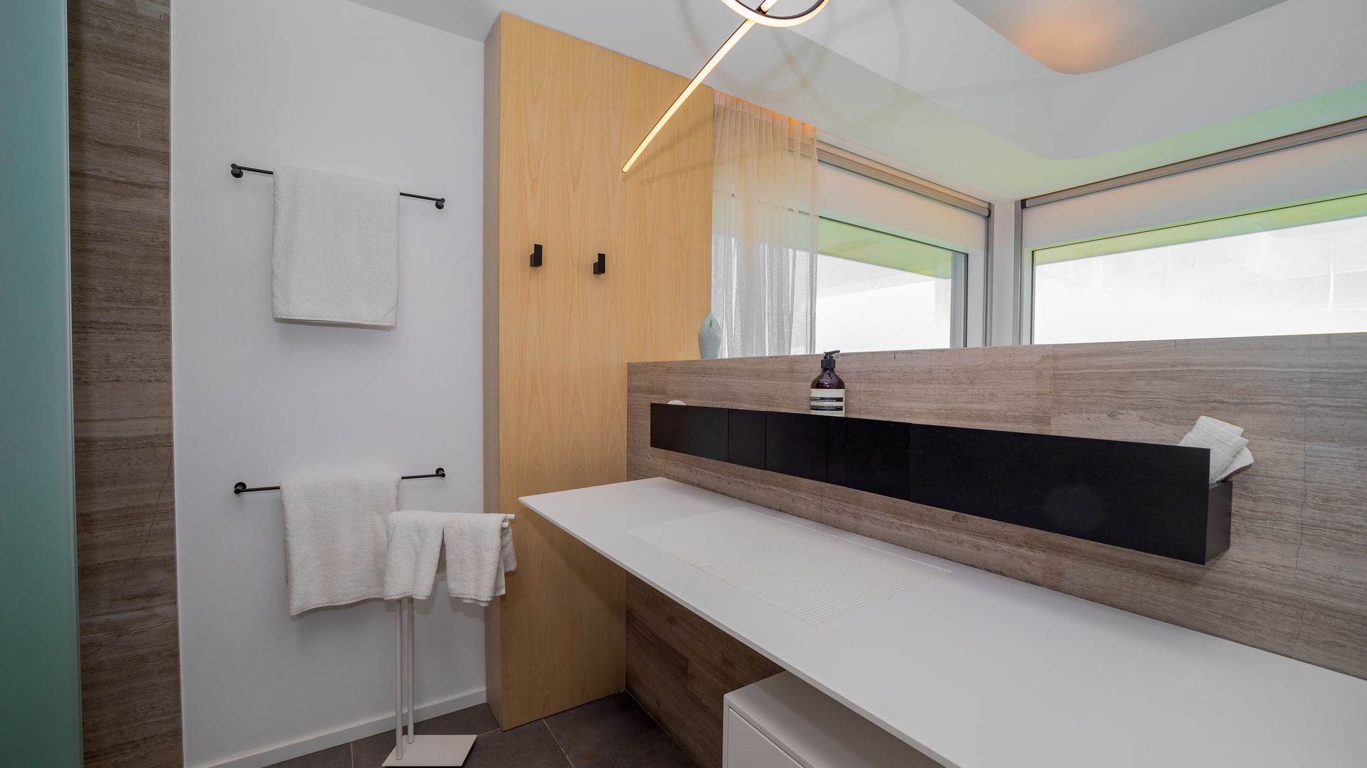 Designed over two levels, the villa rental DOMINGUE welcomes you with a spectacular panoramic view. You’ll discover its magnificent living room, accessible after a few backlit steps in the center of the villa. On one side, the spacious living room is furnished with a sofa and an HD screen in a soothing decor with beige and perfect red colors, as well as a bright yellow bar to prepare your cocktails. On the other side of the staircase, the kitchen can, according to your wishes, either display its modern appliances, or hide them behind white panels, providing the room a pleasant feeling of mineral purity. There is a long red table, to accommodate up to eight guests under contemporary hanging lights, watching the splendid view over St-Barths' waters