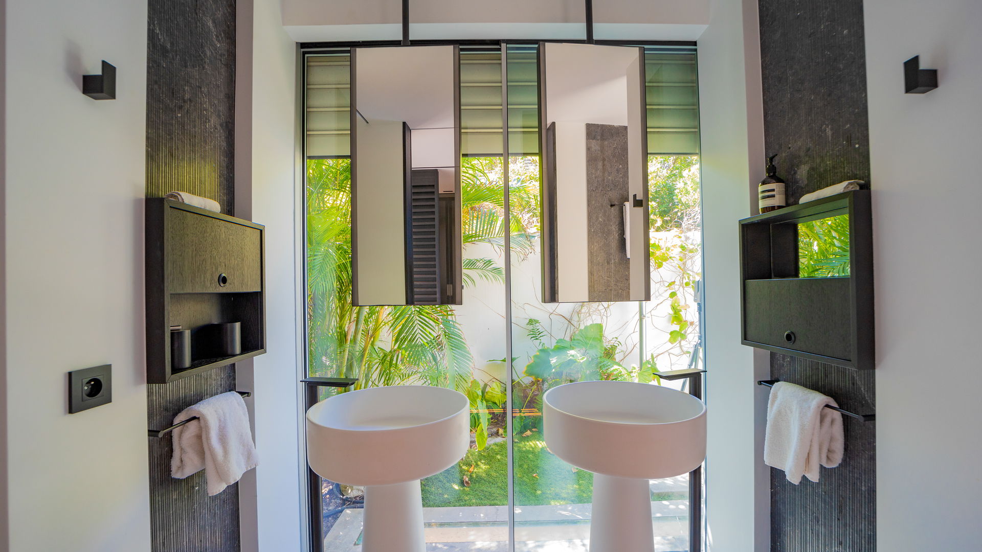 At the front of villa DOMINGUE, you’ll love and never forget the outstanding ocean view. At the center of the terrace, the long swimming pool sparkles in the sunshine on the deck featuring deckchairs on one side and a lawn on the other one. The pergola filters the rays of the Caribbean sun and lets the trade winds gently blow through the outdoor seating area, in front of the magnificent staircase lined with lush vegetation. The outdoor space is perfectly symmetrical and harmonious. A second outdoor living room adjoins the dining room, for delightful, relaxing moments in the tropical breeze. In addition, at the rear of villa DOMINGUE, a fitness room equipped with an HDTV is also at your disposal.
