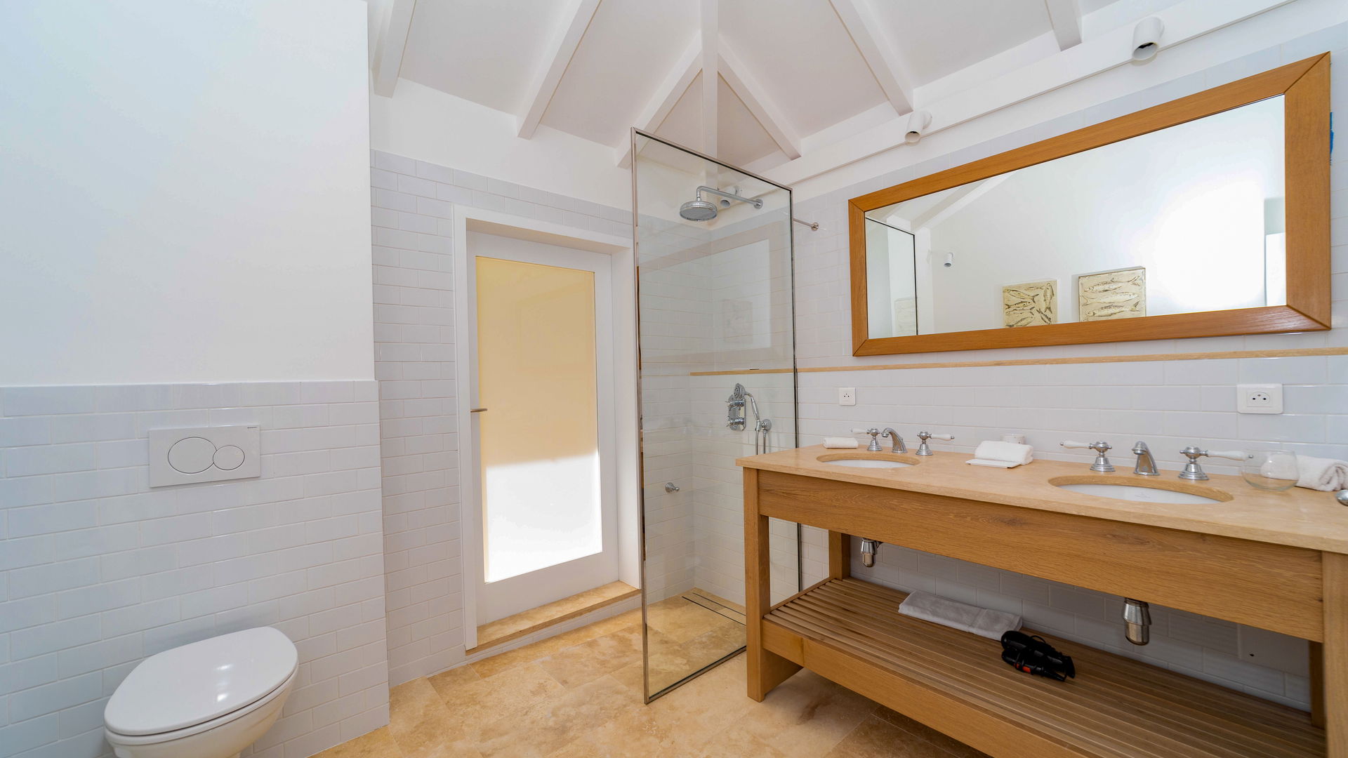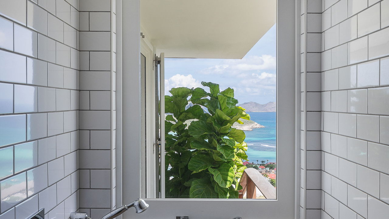 Villa HILL consists of three air-conditioned bedrooms with en-suite bathrooms. Two of them are on the upper level while the third one is on the lower level accessible via a staircase. All three have king size beds and large windows opening onto the outside with stunning ocean views. A daybed is also available on the lower terrace, in a very private and cozy atmosphere, whenever you wish to rest.