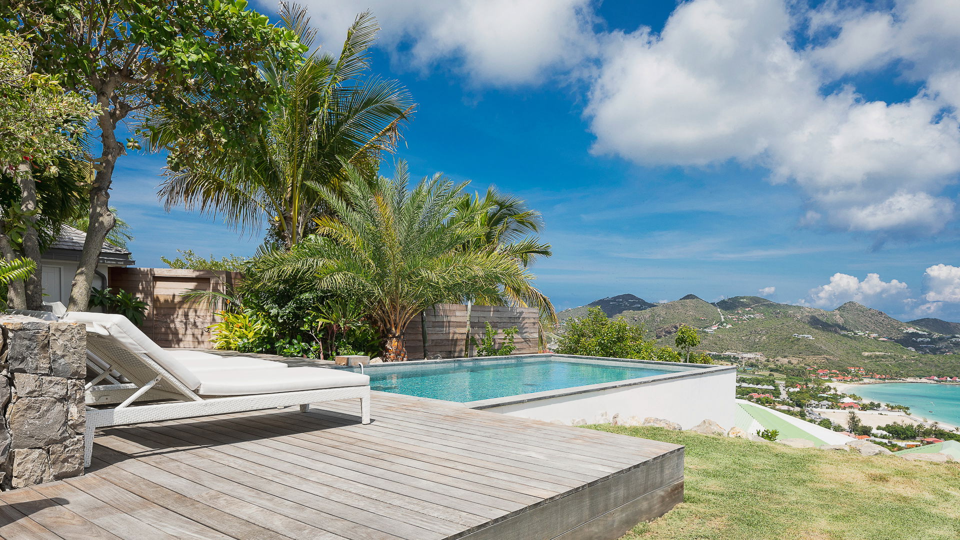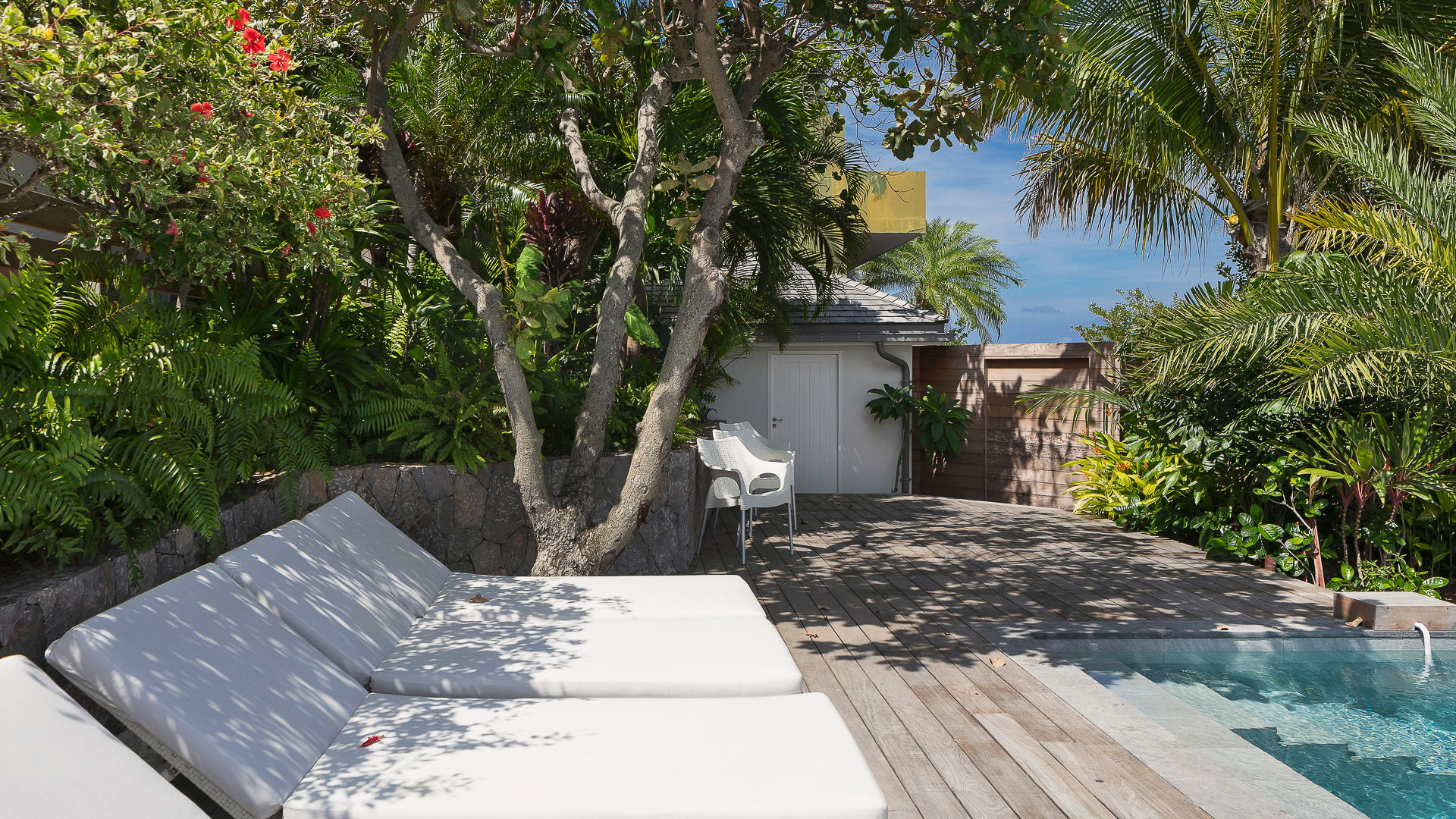 At the front of villa HILL, the terrace is designed around a lovely swimming pool located a few steps below the lower level. Deck chairs, green lawns and local shrubs create an idyllic scenery, a perfect place to swim, lounge or sip a cocktail in the evening. Under the covered part of the terrace located above, the outdoor dining area can accommodate six guests for alfresco dinners close to the second lounge, in front of the amazing view over the island's crystal-clear waters. There is also a comfy terrace at the back of the villa, shaded by banana trees on the hillside, a private place for unique moments out of time.